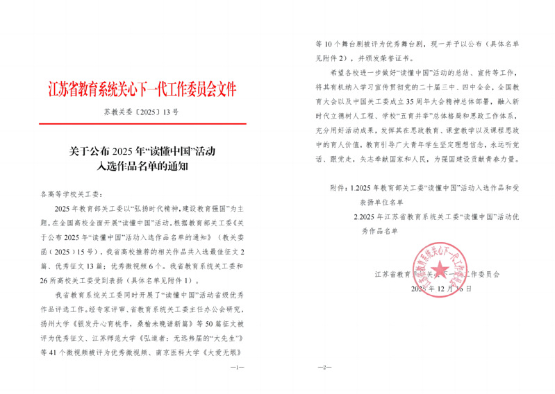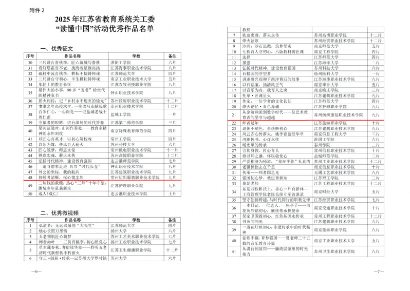 近日,江苏省教育系统关工委下发了《关于公布2025年“读懂中国”活动入选作品名单的通知》(教关委函﹝2025﹞15号),我校选送的创意设计学院关工委制作的微视频《从金陵画派到数字时代——一位艺术教育者的坚守与超越》荣获微视频类优秀奖;选送的智能制造学院姚美梦同学的征文《仰师者清辉,拭心镜尘埃》荣获征文类优秀奖。此次“读懂中国”活动评选微视频类优秀奖共50项,征文类优秀奖共41项。